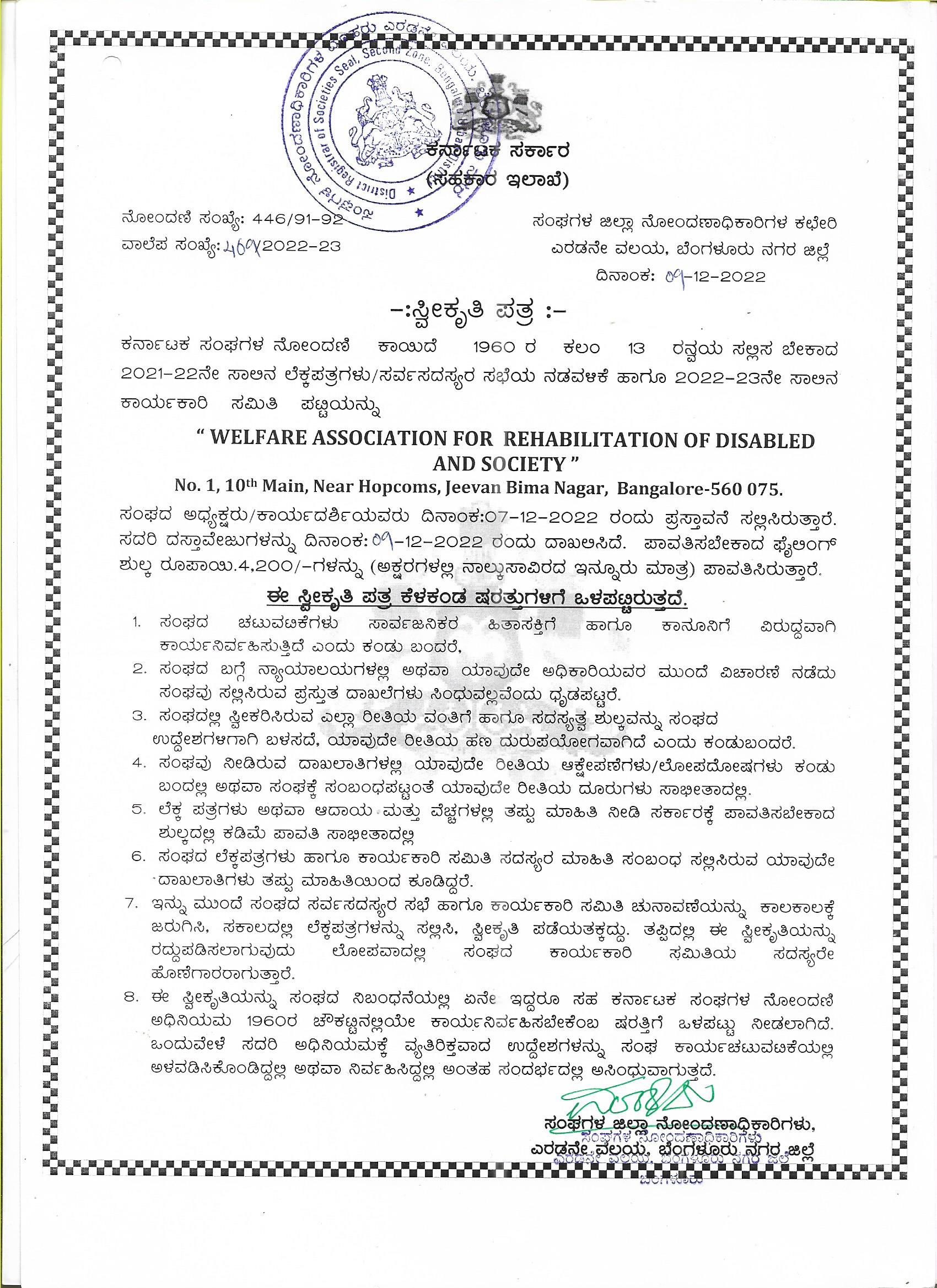 - Accorded with registration certificate under Persons with Disabilities Act in the year 2005 under the Government of Karnataka – Office of the Deputy Director, Women and Child Development And Department for the Empowerment of Differently abled And Senior Citizens, Bengaluru Urban District.